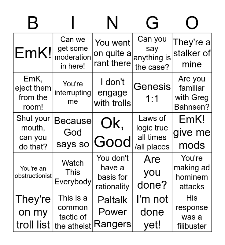 This bingo card has a free space and 24 words: Watch This Everybody, This is a common tactic of the atheist, I don't engage with trolls, They're on my troll list, They're a stalker of mine, EmK!, EmK, eject them from the room!, Can we get some moderation in here!, Laws of logic true all times /all places, You don't have a basis for rationality, Genesis 1:1, Shut your mouth, can you do that?, Are you done?, You're making ad hominem attacks, You're interrupting me, I'm not done yet!, EmK! give me mods, You went on quite a rant there, Are you familiar with Greg Bahnsen?, Because God says so, His response was a filibuster, You're an obstructionist, Can you say anything is the case? and Paltalk Power Rangers.