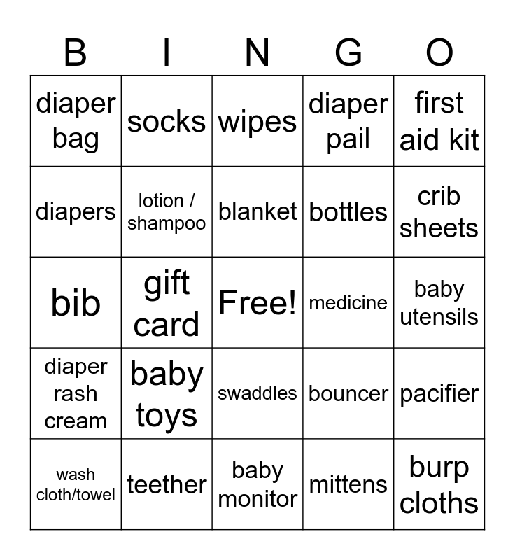 This bingo card has a free space and 28 words: pacifier, crib sheets, bottles, mittens, diapers, wipes, socks, diaper rash cream, medicine, wash cloth/towel, bib, diaper pail, teether, baby monitor, crib sheets, night light, baby toys, lotion / shampoo, blanket, swaddles, diaper bag, sound machine, burp cloths, gift card, baby utensils, bouncer, first aid kit and nursery decor.