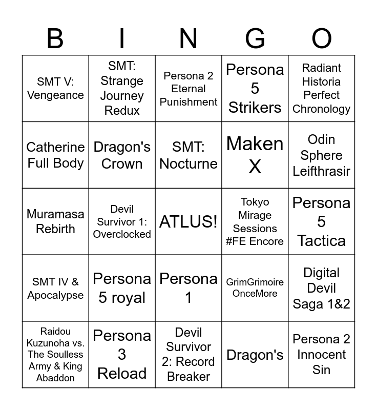This bingo card has a free space and 25 words: Persona 5 royal, Devil Survivor 2: Record Breaker, SMT: Nocturne, Raidou Kuzunoha vs. The Soulless Army & King Abaddon, Radiant Historia Perfect Chronology, SMT V: Vengeance, Catherine Full Body, SMT: Strange Journey Redux, Tokyo Mirage Sessions #FE Encore, Persona 1, Maken X, Muramasa Rebirth, GrimGrimoire OnceMore, Digital Devil Saga 1&2, Dragon's Crown, Soul Hackers 2, Persona 5 Tactica, Persona 2 Eternal Punishment, Odin Sphere Leifthrasir, Devil Survivor 1: Overclocked, Persona 2 Innocent Sin, Persona 3 Reload, SMT IV & Apocalypse, Persona 5 Strikers and Dragon's.