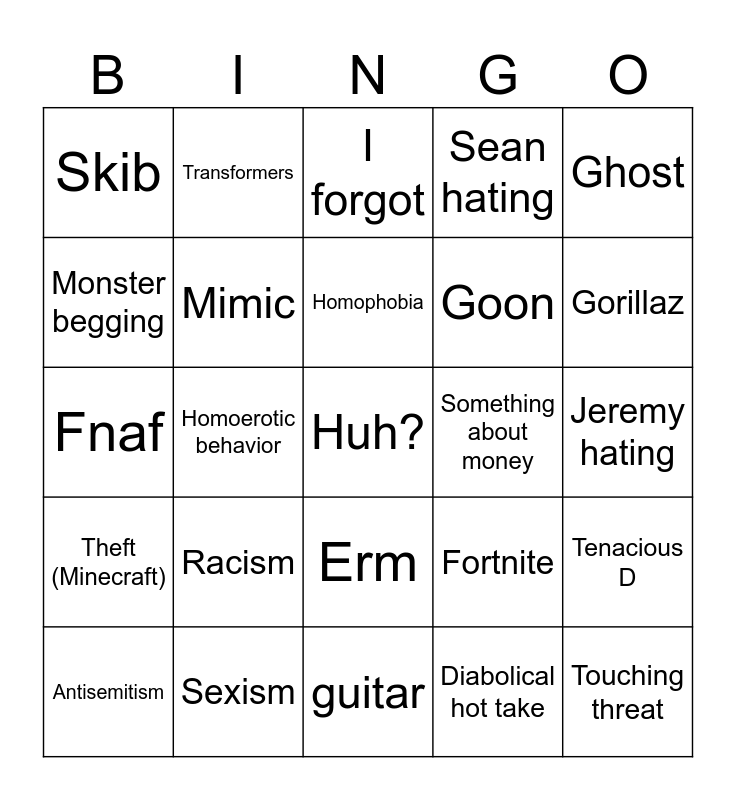 This bingo card has a free space and 24 words: Racism, Sexism, Homophobia, Antisemitism, Ghost, Skib, Monster begging, Transformers, Something about money, Erm, Goon, Fnaf, Fortnite, Tenacious D, Mimic, Diabolical hot take, Jeremy hating, I forgot, Gorillaz, Homoerotic behavior, Touching threat, Theft (Minecraft), Sean hating and guitar.