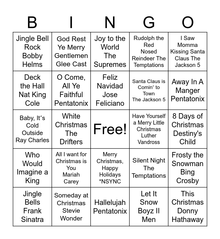 This bingo card has a free space and 24 words: All I want for Christmas is You Mariah Carey, Someday at Christmas Stevie Wonder, Feliz Navidad Jose Feliciano, Jingle Bells Frank Sinatra, I Saw Momma Kissing Santa Claus The Jackson 5, Jingle Bell Rock Bobby Helms, Deck the Hall Nat King Cole, God Rest Ye Merry Gentlemen Glee Cast, Have Yourself a Merry Little Christmas Luther Vandross, Merry Christmas, Happy Holidays *NSYNC, Santa Claus is Cominʼ to Town The Jackson 5, Baby, Itʼs Cold Outside Ray Charles, Silent Night The Temptations, Frosty the Snowman Bing Crosby, O Come, All Ye Faithful Pentatonix, Let It Snow Boyz II Men, 8 Days of Christmas Destiny's Child, Joy to the World The Supremes, Away In A Manger Pentatonix, White Christmas The Drifters, This Christmas Donny Hathaway, Who Would Imagine a King, Rudolph the Red Nosed Reindeer The Temptations and Hallelujah Pentatonix.