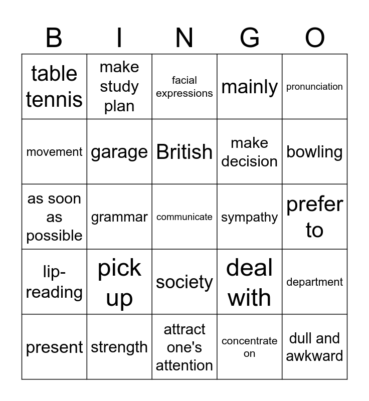 This bingo card has 37 words: Free!, put off, repaint, garage, department, pick up, British, vocabulary, pronunciation, spelling, grammar, mainly, communicate, prefer to, movement, lip-reading, sign language, facial expressions, society, sympathy, table tennis, bowling, present, attract one's attention, give sb a ride, concentrate on, make study plan, repair, heart attack, physical examination, tent, strength, as soon as possible, dull and awkward, deal with, make decision and depend on.
