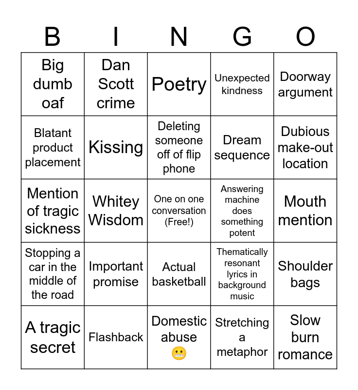 This bingo card has a free space and 32 words: Stretching a metaphor, Brooding, Whitey Wisdom, Marriage troubles, Stopping a car in the middle of the road, Kissing, Doorway argument, Shoulder bags, Dan Scott crime, Mom issues, Deleting someone off of flip phone, Poetry, Dramatic montage, Return of a past character, Answering machine does something potent, Failing the Bechdel test, A tragic secret, Mention of tragic sickness, Actual basketball, Important promise, Thematically resonant lyrics in background music, Hailey’s music career mention, Mouth mention, Flashback, Slow burn romance, Unexpected kindness, Dream sequence, Blatant product placement, Big dumb oaf, Domestic abuse 😬, Everyone around Peyton sabotaging her and Dubious make-out location.