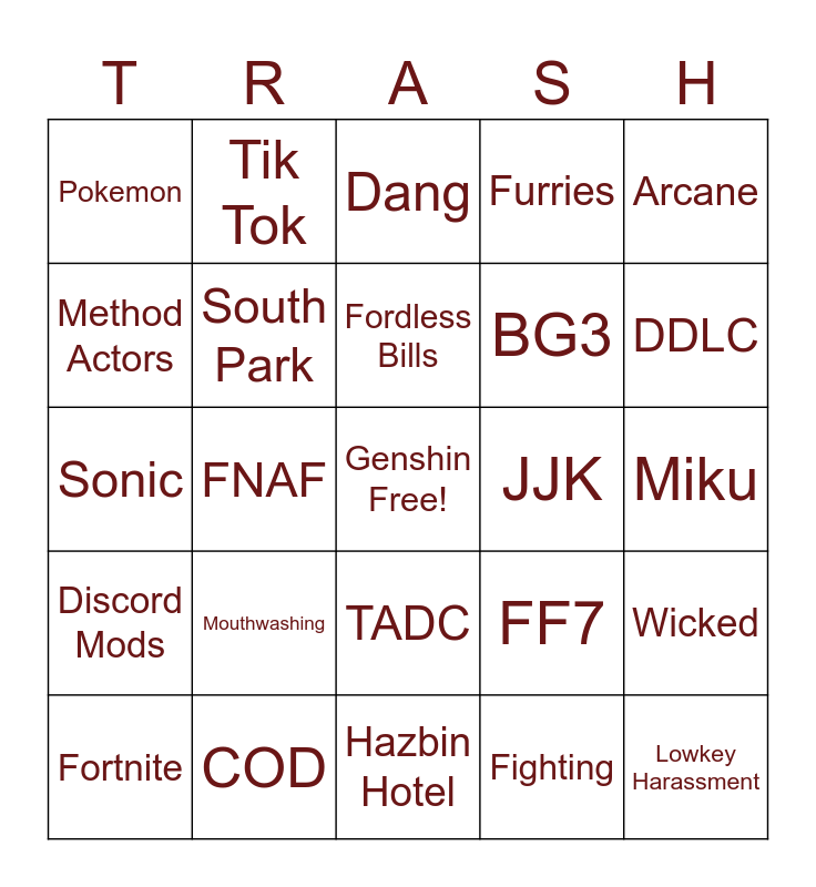 This bingo card has a free space and 24 words: Mouthwashing, COD, Fordless Bills, Fortnite, Arcane, Pokemon, Method Actors, Tik Tok, JJK, TADC, BG3, Sonic, FF7, Wicked, South Park, Fighting, Miku, Dang, DDLC, FNAF, Lowkey Harassment, Discord Mods, Furries and Hazbin Hotel.