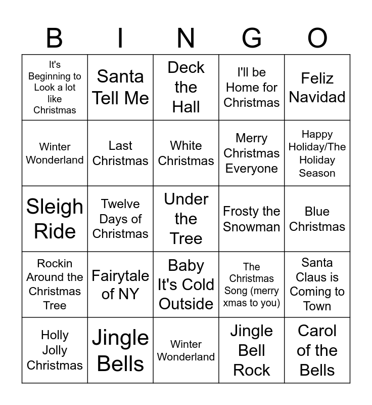 This bingo card has a free space and 24 words: Fairytale of NY, Jingle Bells, White Christmas, Holly Jolly Christmas, Feliz Navidad, It's Beginning to Look a lot like Christmas, Winter Wonderland, Santa Tell Me, Frosty the Snowman, Baby It's Cold Outside, Merry Christmas Everyone, Sleigh Ride, The Christmas Song (merry xmas to you), Santa Claus is Coming to Town, Last Christmas, Jingle Bell Rock, Blue Christmas, Deck the Hall, Happy Holiday/The Holiday Season, Twelve Days of Christmas, Carol of the Bells, Rockin Around the Christmas Tree, I'll be Home for Christmas and Winter Wonderland.
