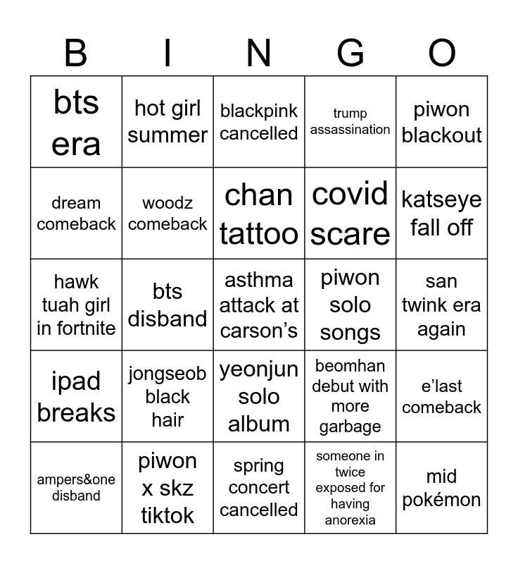 This bingo card has a free space and 24 words: jongseob black hair, piwon x skz tiktok, chan tattoo, ampers&one disband, piwon blackout, bts era, dream comeback, hot girl summer, piwon solo songs, yeonjun solo album, covid scare, hawk tuah girl in fortnite, beomhan debut with more garbage, e’last comeback, woodz comeback, someone in twice exposed for having anorexia, san twink era again, blackpink cancelled, katseye fall off, bts disband, mid pokémon, ipad breaks, trump assassination and spring concert cancelled.