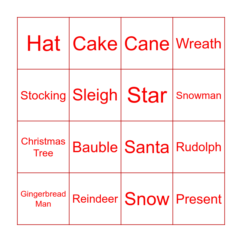 This bingo card has 16 words: Gingerbread Man, Reindeer, Cane, Wreath, Stocking, Cake, Santa, Rudolph, Hat, Sleigh, Snow, Snowman, Christmas Tree, Bauble, Star and Present.