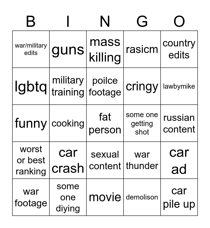 This bingo card has a free space and 24 words: car crash, some one diying, poilce footage, war footage, country edits, war/military edits, lgbtq, guns, some one getting shot, sexual content, cringy, funny, war thunder, car ad, military training, demolison, russian content, mass killing, lawbymike, cooking, car pile up, worst or best ranking, rasicm and movie.