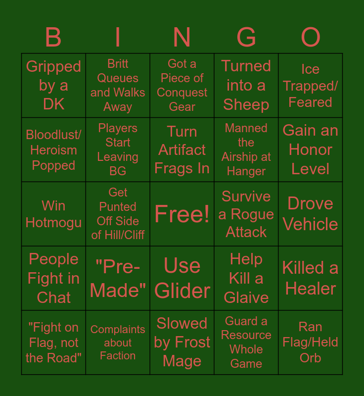 This bingo card has a free space and 24 words: "Pre-Made", Complaints about Faction, Turn Artifact Frags In, "Fight on Flag, not the Road", Ice Trapped/ Feared, Gripped by a DK, Bloodlust/ Heroism Popped, Britt Queues and Walks Away, Survive a Rogue Attack, Use Glider, Manned the Airship at Hanger, Win Hotmogu, Help Kill a Glaive, Killed a Healer, Players Start Leaving BG, Guard a Resource Whole Game, Drove Vehicle, Got a Piece of Conquest Gear, Gain an Honor Level, Get Punted Off Side of Hill/Cliff, Ran Flag/Held Orb, People Fight in Chat, Turned into a Sheep and Slowed by Frost Mage.