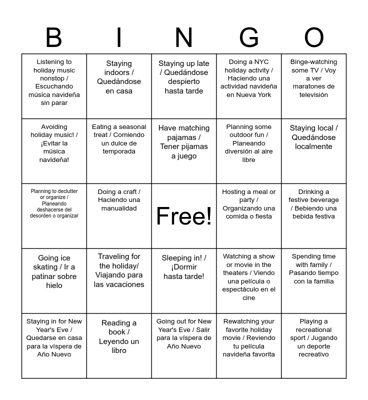 This bingo card has a free space and 24 words: Traveling for the holiday/ Viajando para las vacaciones, Reading a book / Leyendo un libro, Have matching pajamas / Tener pijamas a juego, Staying in for New Year's Eve / Quedarse en casa para la víspera de Año Nuevo, Binge-watching some TV / Voy a ver maratones de televisión, Listening to holiday music nonstop / Escuchando música navideña sin parar, Avoiding holiday music! / ¡Evitar la música navideña!, Staying indoors / Quedándose en casa, Hosting a meal or party / Organizando una comida o fiesta, Sleeping in! / ¡Dormir hasta tarde!, Planning some outdoor fun / Planeando diversión al aire libre, Planning to declutter or organize / Planeando deshacerse del desorden o organizar, Watching a show or movie in the theaters / Viendo una película o espectáculo en el cine, Spending time with family / Pasando tiempo con la familia, Eating a seasonal treat / Comiendo un dulce de temporada, Rewatching your favorite holiday movie / Reviendo tu película navideña favorita, Drinking a festive beverage / Bebiendo una bebida festiva, Staying up late / Quedándose despierto hasta tarde, Staying local / Quedándose localmente, Doing a craft / Haciendo una manualidad, Playing a recreational sport / Jugando un deporte recreativo, Going ice skating / Ir a patinar sobre hielo, Doing a NYC holiday activity / Haciendo una actividad navideña en Nueva York and Going out for New Year's Eve / Salir para la víspera de Año Nuevo.