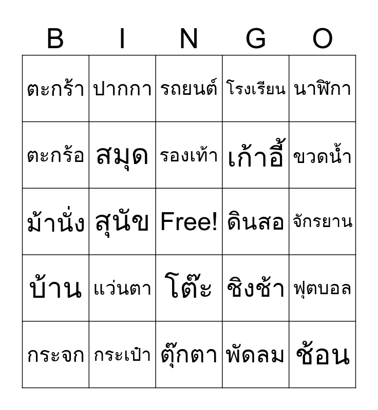 This bingo card has a free space and 24 words: แว่นตา, กระเป๋า, รองเท้า, กระจก, นาฬิกา, ตะกร้า, ตะกร้อ, ปากกา, ดินสอ, โต๊ะ, เก้าอี้, ม้านั่ง, ชิงช้า, ฟุตบอล, สมุด, พัดลม, จักรยาน, รถยนต์, ขวดน้ำ, สุนัข, ช้อน, บ้าน, โรงเรียน and ตุ๊กตา.
