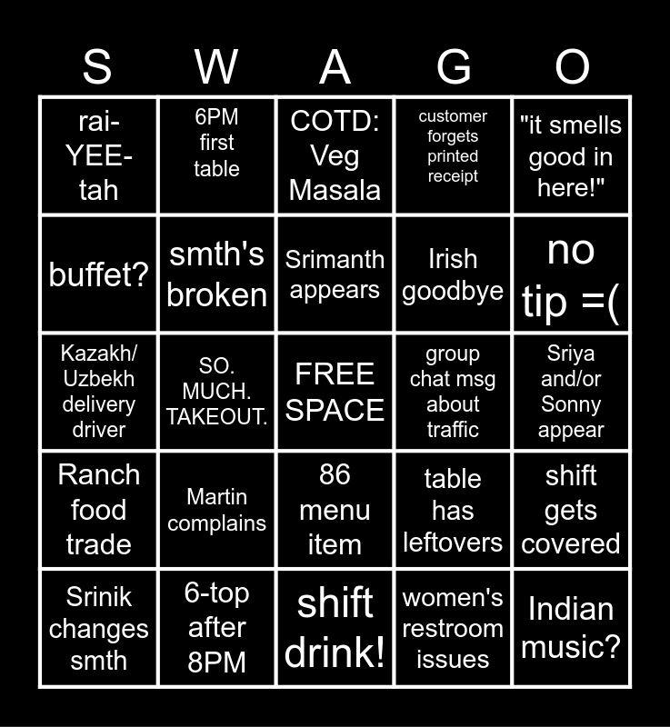 This bingo card has a free space and 24 words: Martin complains, 6-top after 8PM, Srimanth appears, Srinik changes smth, "it smells good in here!", rai-YEE-tah, buffet?, 6PM first table, group chat msg about traffic, 86 menu item, Irish goodbye, Kazakh/ Uzbekh delivery driver, table has leftovers, shift gets covered, smth's broken, women's restroom issues, Sriya and/or Sonny appear, COTD: Veg Masala, no tip =(, SO. MUCH. TAKEOUT., Indian music?, Ranch food trade, customer forgets printed receipt and shift drink!.