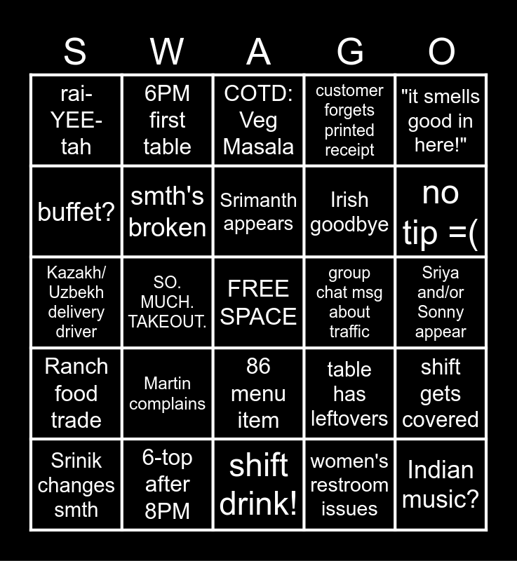 This bingo card has a free space and 24 words: Martin complains, 6-top after 8PM, Srimanth appears, Srinik changes smth, "it smells good in here!", rai-YEE-tah, buffet?, 6PM first table, group chat msg about traffic, 86 menu item, Irish goodbye, Kazakh/ Uzbekh delivery driver, table has leftovers, shift gets covered, smth's broken, women's restroom issues, Sriya and/or Sonny appear, COTD: Veg Masala, no tip =(, SO. MUCH. TAKEOUT., Indian music?, Ranch food trade, customer forgets printed receipt and shift drink!.