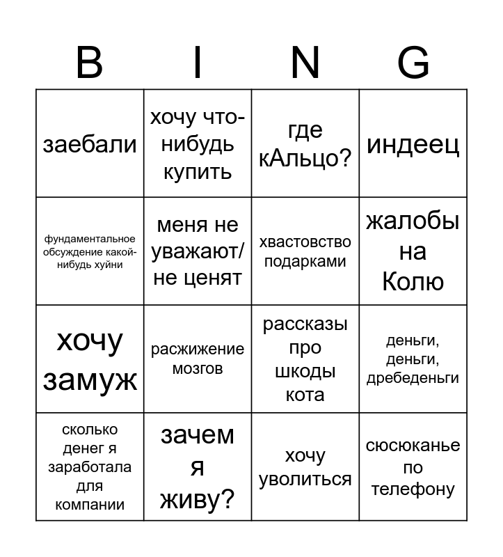 This bingo card has 16 words: зачем я живу?, деньги, деньги, дребеденьги, где кАльцо?, заебали, хочу замуж, хочу что-нибудь купить, рассказы про шкоды кота, хочу уволиться, фундаментальное обсуждение какой-нибудь хуйни, меня не уважают/не ценят, сколько денег я заработала для компании, индеец, расжижение мозгов, жалобы на Колю, хвастовство подарками and сюсюканье по телефону.