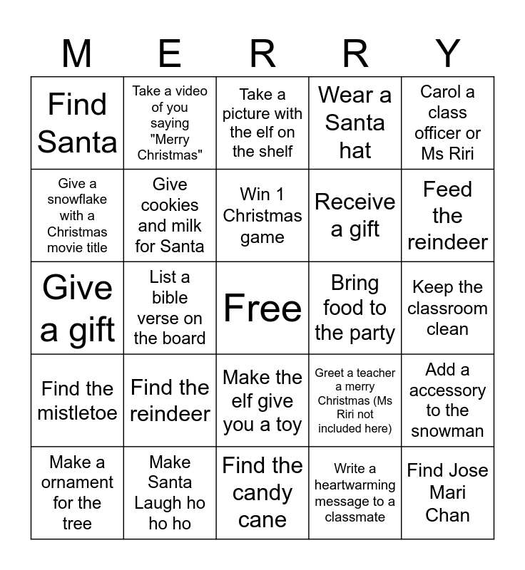 This bingo card has a free space and 24 words: Find the reindeer, Make Santa Laugh ho ho ho, Win 1 Christmas game, Make a ornament for the tree, Carol a class officer or Ms Riri, Find Santa, Give a snowflake with a Christmas movie title, Take a video of you saying "Merry Christmas", Bring food to the party, Make the elf give you a toy, Receive a gift, Give a gift, Greet a teacher a merry Christmas (Ms Riri not included here), Add a accessory to the snowman, Give cookies and milk for Santa, Write a heartwarming message to a classmate, Keep the classroom clean, Take a picture with the elf on the shelf, Feed the reindeer, List a bible verse on the board, Find Jose Mari Chan, Find the mistletoe, Wear a Santa hat and Find the candy cane.