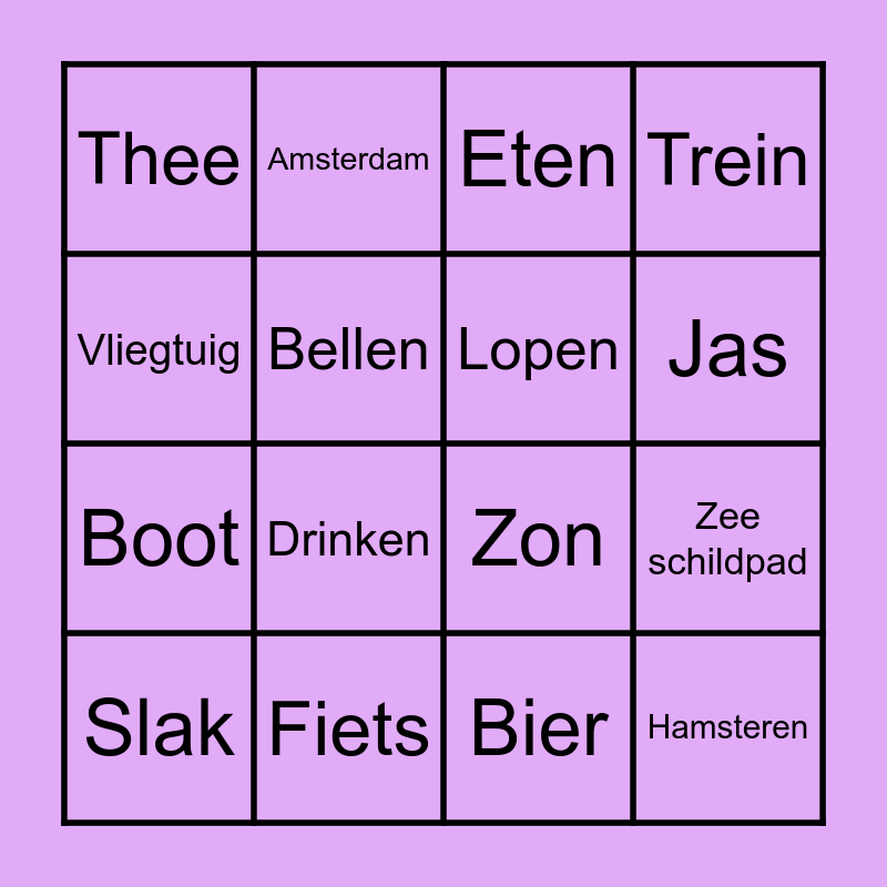 This bingo card has 35 words: Houden, Poes, Hond, Lopen, Houden van, Trein, Bellen, Rok, Jas, Sjaal, Zon, Vliegtuig, Bloemkool, Koffie, Thee, Fiets, Nederland, Zee schildpad, Hamsteren, Slak, Regen, Baby, Boek, Bril, Eten, Drinken, Appel, Camera, Boot, Bier, Auto, Huis, Slapen, Amsterdam and Bliksem.