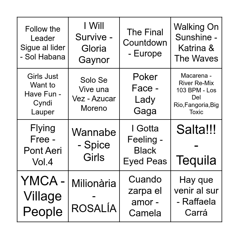 This bingo card has 75 words: Fiesta Pagana - Mägo de Oz, The Ketchup Song (Aserejé) - Spanish Version - Las Ketchup, The Final Countdown - Europe, Para No Verte Más - La Mosca Tse-Tse, Bonito - Jarabe De Palo, Vivir Mi Vida - Marc Anthony, Princesas - Pereza, All I Want for Christmas Is You - Mariah Carey, Believe - Cher, Suavemente - Elvis Crespo, Total Eclipse of the Heart - Bonnie Tyler, Mambo No. 5 (a Little Bit of...) - Lou Bega, Macarena - River Re-Mix 103 BPM - Los Del Rio,Fangoria,Big Toxic, Solo Se Vive una Vez - Azucar Moreno, Amigos para Siempre - Los Manolos, Salta!!! - Tequila, Ay Mamá - Rigoberta Bandini, YMCA - Village People, Gimme! Gimme! Gimme! (A Man After Midnight) - ABBA, Girls Just Want to Have Fun - Cyndi Lauper, Blinding Lights - The Weeknd, I Gotta Feeling - Black Eyed Peas, Poker Face - Lady Gaga, I Will Survive - Gloria Gaynor, Walking On Sunshine - Katrina & The Waves, Don't Stop Me Now - Remastered 2011 - Queen, Stayin Alive - Bee Gees, Tacones Rojos - Sebastian Yatra, La chica yeyé - Ole Ole, LAS 12 - Ana Mena,Belinda, Formentera - Aitana,Nicki Nicole, Pepas - Farruko, It's Raining Men - Geri Halliwell, Crazy In Love (feat. Jay-Z) - Beyoncé,JAY-Z, Wannabe - Spice Girls, Flying Free - Pont Aeri Vol.4, Saturday Night - Radio Mix - Whigfield, Ritmo De La Noche - Safri Duo,Clark Anderson, Cuando zarpa el amor - Camela, Yo Quiero Bailar - Sonia Y Selena, Ave María - David Bisbal, Que La Detengan - David Civera, Torero - Chayanne, Sarandonga - Lolita, Por la Raja de Tu Falda - Estopa, Gasolina - Daddy Yankee, Livin' la Vida Loca - Ricky Martin, Follow the Leader Sigue al lider - Sol Habana, Olvídame y Pega la Vuelta - Pimpinela, La Gozadera (feat. Marc Anthony) - Gente De Zona,Marc Anthony, La Camisa Negra - Juanes, Viva La Vida - Coldplay, Lady Marmalade - From Moulin Rouge Soundtrack - Christina Aguilera,Lil' Kim,Mýa,P!nk, Whenever, Wherever - Shakira, L'Amour Toujours - Gigi D'Agostino, Billie Jean - Michael Jackson, ...Baby One More Time - Britney Spears, You're The One That I Want - From “Grease” - John Travolta,Olivia Newton-John, I Want It That Way - Backstreet Boys, It's My Life - Bon Jovi, Dancing Queen - ABBA, Blame It on the Boogie - The Jacksons, I Wanna Dance with Somebody (Who Loves Me) - Whitney Houston, DESPECHÁ - ROSALÍA, Monotonía - Shakira,Ozuna, Milionària - ROSALÍA, Todos los días sale el sol - Bongo Botrako, La Revolución Sexual - La Casa Azul, Mari Carmen - La Pegatina, Quevedo: Bzrp Music Sessions, Vol. 52 - Bizarrap,Quevedo, Hay que venir al sur - Raffaela Carrá, Me Colé en una Fiesta - Mecano, A quién le importa - Alaska Y Dinarama, Mi gran noche - Raphael and La Bomba - King Africa.