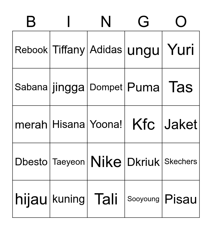 This bingo card has a free space and 24 words: Taeyeon, kuning, Dompet, hijau, Yuri, Rebook, Sabana, Tiffany, Kfc, Nike, Puma, merah, Dkriuk, Skechers, jingga, Sooyoung, Jaket, Adidas, Tas, Hisana, Pisau, Dbesto, ungu and Tali.