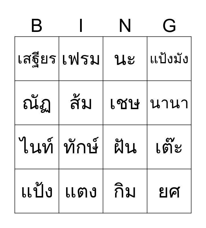 This bingo card has 16 words: แตง, เต๊ะ, นะ, เสฐียร, ไนท์, เฟรม, ฝัน, กิม, ณัฏ, ส้ม, แป้ง, แป้งมัง, ทักษ์, นานา, เชษ and ยศ.