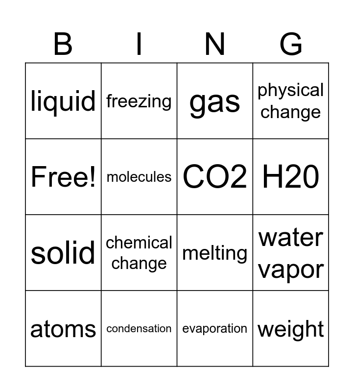 This bingo card has 16 words: condensation, water vapor, gas, liquid, solid, freezing, melting, evaporation, Free!, molecules, atoms, physical change, chemical change, H20, CO2 and weight.