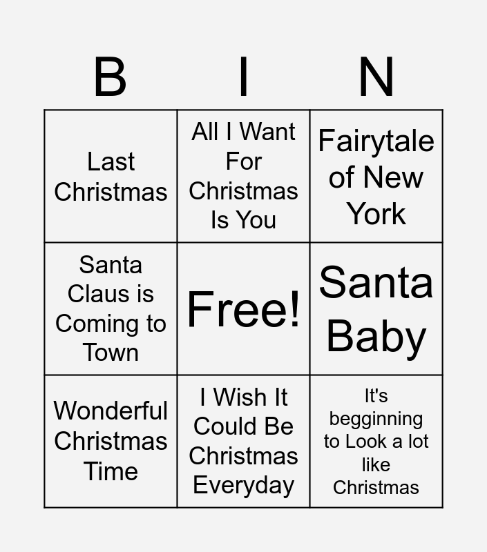 This bingo card has a free space and 8 words: Santa Baby, Fairytale of New York, All I Want For Christmas Is You, Wonderful Christmas Time, Last Christmas, It's begginning to Look a lot like Christmas, Santa Claus is Coming to Town and I Wish It Could Be Christmas Everyday.