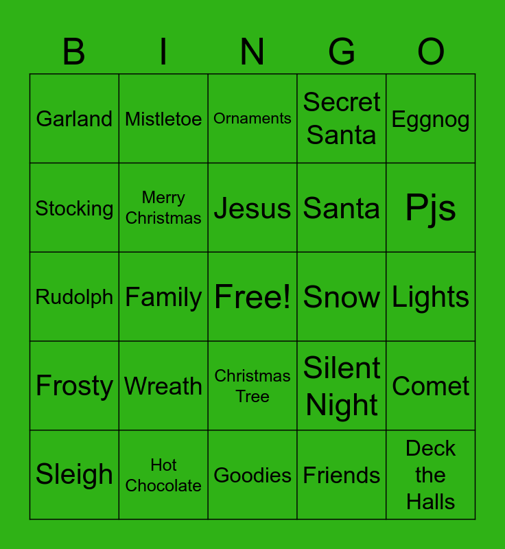 This bingo card has a free space and 29 words: Sleigh, Presents, Family, Christmas Star, Garland, Ornaments, Merry Christmas, Wreath, Snow, Hot Chocolate, Lights, Deck the Halls, Goodies, Friends, Pjs, Angel, Christmas Tree, Frosty, Eggnog, Rudolph, Silent Night, Candy Cane, Santa, Stocking, Secret Santa, Mistletoe, Comet, Jesus and Gingerbread House.