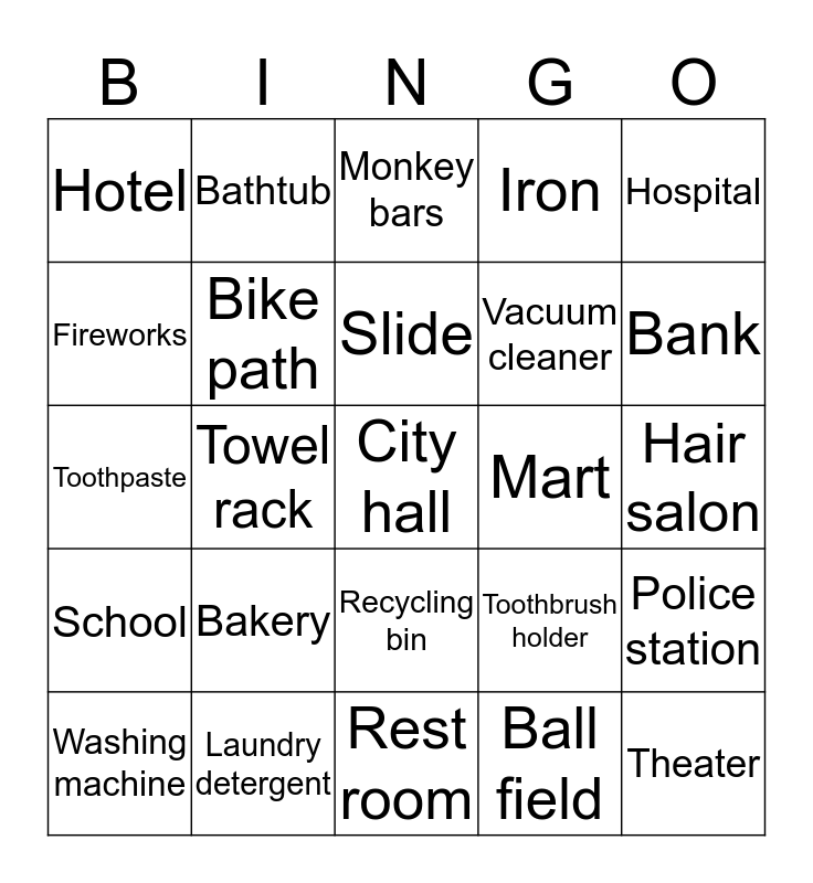 This bingo card has 72 words: Free!, Bathtub, Towel rack, Sink, Brush, Nail cutter, Iron, Ironing board, Vacuum cleaner, Mop, Washing machine, Fire station, Bank, Hotel, Church, Toothpaste, Toothbrush holder, Hospital, Barber shop, Hair salon, Bakery, City hall, Police station, Park, Drain, Faucet, Toilet paper, Toilet, Mirror, Toothbrush, Laundry detergent, Fabric softener, Bleach, Hanger, Ball field, Tennis court, Roller coaster, bumper car, Fireworks, Laundry basket, Recycling bin, Theater, Gas station, Market, Health club, School, Library, Post office, Laundry, Pharmacy, Convenience store, Department store, Grocery store, Mart, Merry-go-round, Jungle gym, Monkey bars, Slide, Swing, Seesaw, Sandbox, Bench, Jogging path, Rest room, fountain, Water fountain, Bike path, Soap, Razor, Scale, Bidet and Comb.