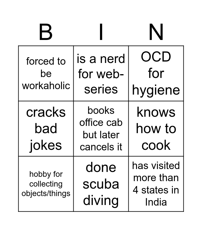 This bingo card has a free space and 23 words: Likes pets, Likes to read, done scuba diving, knows how to play any musical instrument, has visited more than 4 states in India, forced to be workaholic, knows how to cook, is a nerd for web-series, has watched more than 3 movies in a row, has a good memory, accidentally sends a wrong text to someone, bad at remembering dates, sneaked in to your house late at night to avoid trouble, is always sleepy, got stuck in an office elevator, accidentally shared wrong screen at work, OCD for hygiene, clumsy at handling things, hobby for collecting objects/things, spontaneous in planning things, cracks bad jokes, got chased by any animal and has a record for missing flight/train.