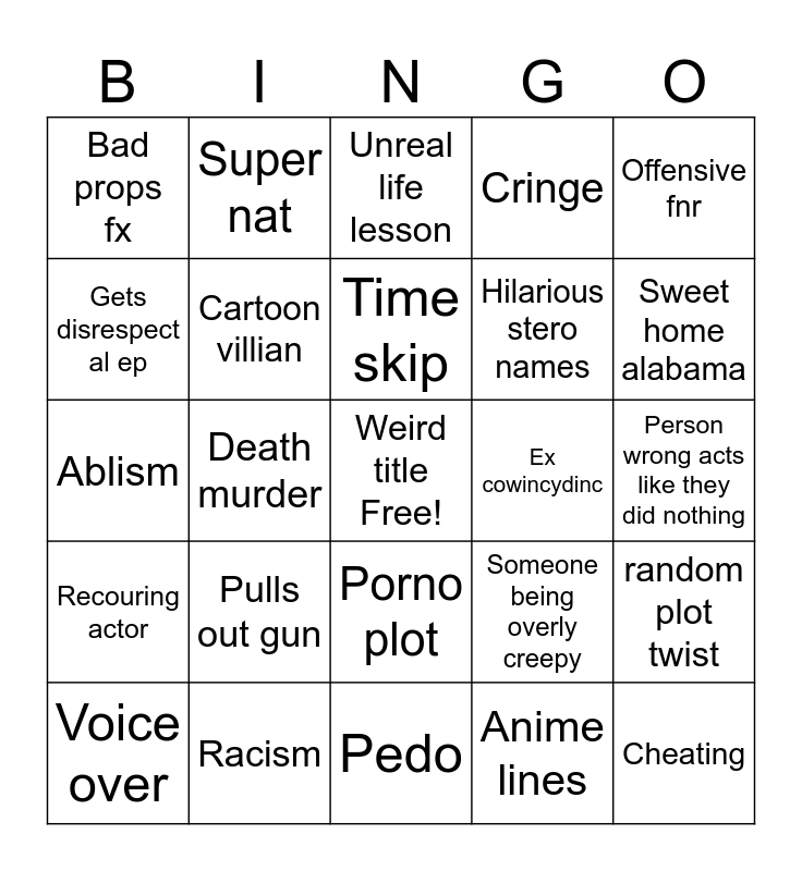 This bingo card has a free space and 24 words: Pulls out gun, Racism, Time skip, Voice over, Offensive fnr, Bad props fx, Gets disrespect al ep, Super nat, Ex cowincydinc, Porno plot, Hilarious stero names, Ablism, Someone being overly creepy, random plot twist, Cartoon villian, Anime lines, Person wrong acts like they did nothing, Unreal life lesson, Sweet home alabama, Death murder, Cheating, Recouring actor, Cringe and Pedo.