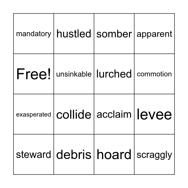 This bingo card has 16 words: debris, levee, somber, mandatory, exasperated, hustled, acclaim, hoard, Free!, unsinkable, steward, apparent, collide, commotion, lurched and scraggly.