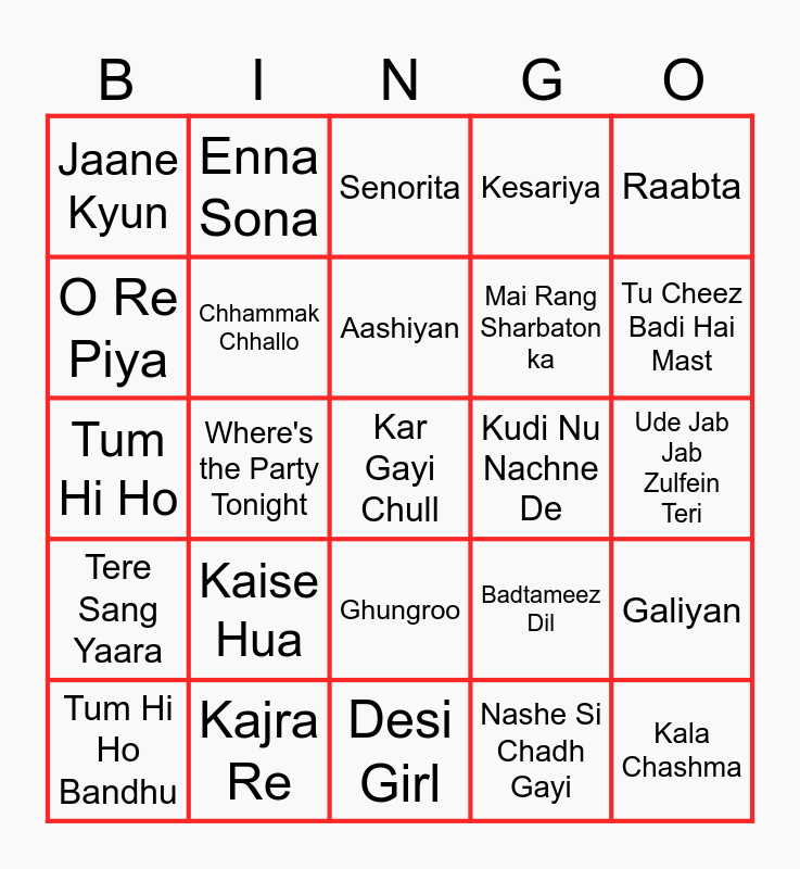 This bingo card has 30 words: Kajra Re, Dhoom Machale, Where's the Party Tonight, Aankhon Mein Teri, Jaane Kyun, Senorita, Chhammak Chhallo, Ghungroo, Kudi Nu Nachne De, Desi Girl, Ude Jab Jab Zulfein Teri, Kar Gayi Chull, Nashe Si Chadh Gayi, Kala Chashma, Tu Cheez Badi Hai Mast, Gallan Goodiyaan, Badtameez Dil, Tere Sang Yaara, Kaise Hua, Raabta, Tum Hi Ho, Dil Diyan Gallan, Enna Sona, Mai Rang Sharbaton ka, O Re Piya, Kesariya, Galiyan, Tum Hi Ho Bandhu, Aashiyan and Tune Mari Entry.
