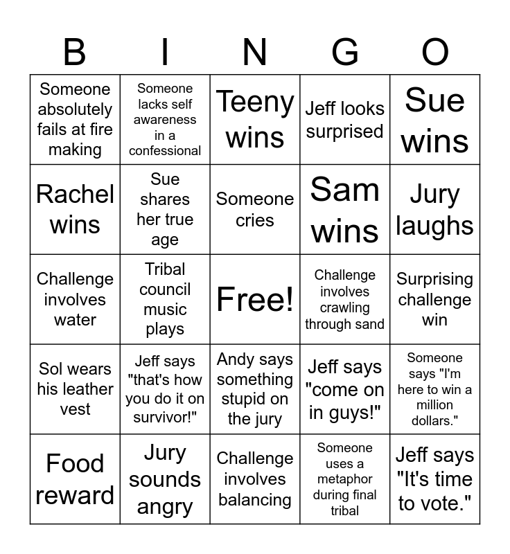 This bingo card has a free space and 24 words: Jeff says "that's how you do it on survivor!", Jury sounds angry, Someone cries, Food reward, Sue wins, Someone absolutely fails at fire making, Rachel wins, Someone lacks self awareness in a confessional, Challenge involves crawling through sand, Andy says something stupid on the jury, Sam wins, Challenge involves water, Jeff says "come on in guys!", Someone says "I'm here to win a million dollars.", Sue shares her true age, Someone uses a metaphor during final tribal, Surprising challenge win, Teeny wins, Jury laughs, Tribal council music plays, Jeff says "It's time to vote.", Sol wears his leather vest, Jeff looks surprised and Challenge involves balancing.