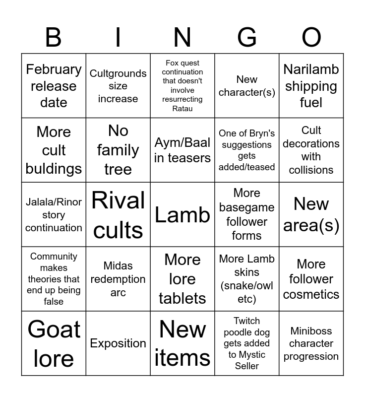This bingo card has a free space and 24 words: Midas redemption arc, Exposition, Aym/Baal in teasers, Goat lore, Narilamb shipping fuel, February release date, More cult buldings, Cultgrounds size increase, More basegame follower forms, More lore tablets, One of Bryn's suggestions gets added/teased, Jalala/Rinor story continuation, More Lamb skins (snake/owl etc), More follower cosmetics, No family tree, Twitch poodle dog gets added to Mystic Seller, New area(s), Fox quest continuation that doesn't involve resurrecting Ratau, Cult decorations with collisions, Rival cults, Miniboss character progression, Community makes theories that end up being false, New character(s) and New items.