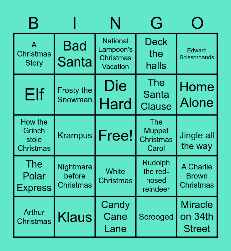 This bingo card has a free space and 24 words: Nightmare before Christmas, Klaus, Die Hard, Arthur Christmas, Edward Scissorhands, A Christmas Story, Elf, Bad Santa, The Muppet Christmas Carol, White Christmas, The Santa Clause, How the Grinch stole Christmas, Rudolph the red-nosed reindeer, A Charlie Brown Christmas, Frosty the Snowman, Scrooged, Jingle all the way, National Lampoon's Christmas Vacation, Home Alone, Krampus, Miracle on 34th Street, The Polar Express, Deck the halls and Candy Cane Lane.