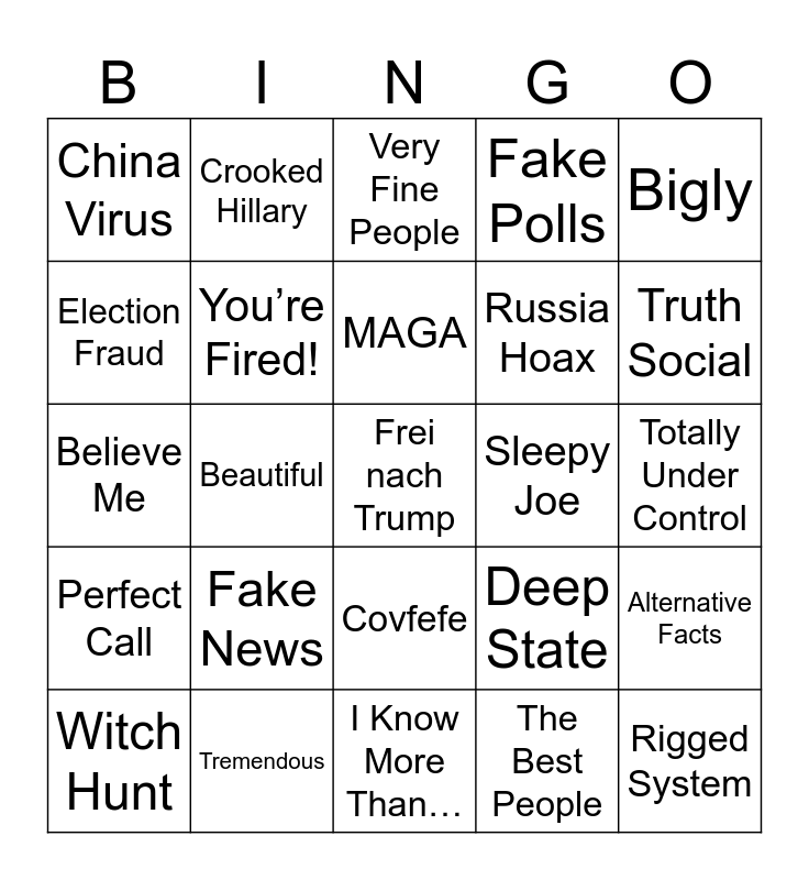 This bingo card has a free space and 24 words: Fake News, Tremendous, MAGA, Witch Hunt, Bigly, China Virus, Election Fraud, Crooked Hillary, Sleepy Joe, Covfefe, Russia Hoax, Believe Me, Deep State, Alternative Facts, You’re Fired!, The Best People, Totally Under Control, Very Fine People, Truth Social, Beautiful, Rigged System, Perfect Call, Fake Polls and I Know More Than….