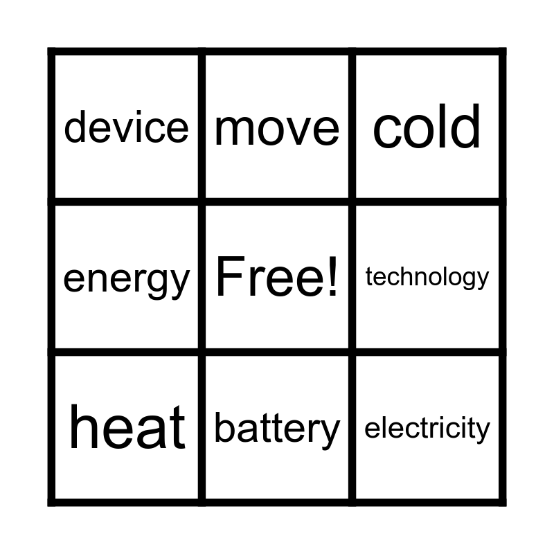 This bingo card has a free space and 10 words: battery, cold, device, electricity, energy, heat, move, store, technology and work.