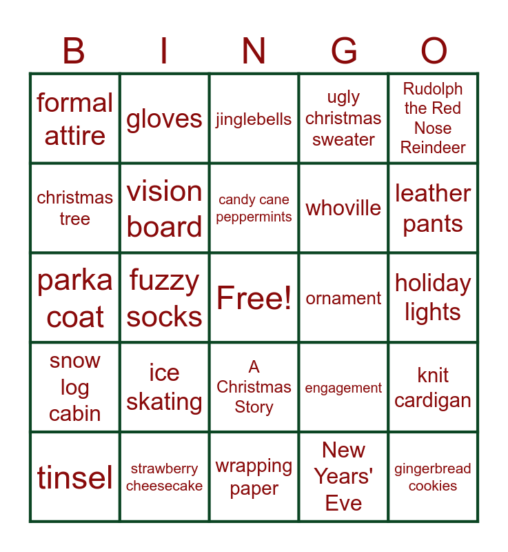 This bingo card has a free space and 44 words: mistletoe, gingerbread cookies, The Grinch Stole Christmas, tinsel, egg nog, New Years' Eve, jinglebells, hot chocolate, Rudolph the Red Nose Reindeer, strawberry cheesecake, ugly christmas sweater, ornament, A Christmas Story, ice skating, snowflake, wrapping paper, end-of-season sale, parka coat, cable knit sweater, leather pants, gloves, turtleneck top, puffer vest, formal attire, A Charlie Brown Christmas, holiday lights, white elephant, diamond earrings, engagement, snow log cabin, straight leg trousers, knit cardigan, nutmeg, chocolate chip cookies, fuzzy socks, frosted sugar cookies, The Polar Express, chelsea boots, candy cane peppermints, christmas tree, whoville, the nutcracker, vision board and fluffy syrup pancakes.