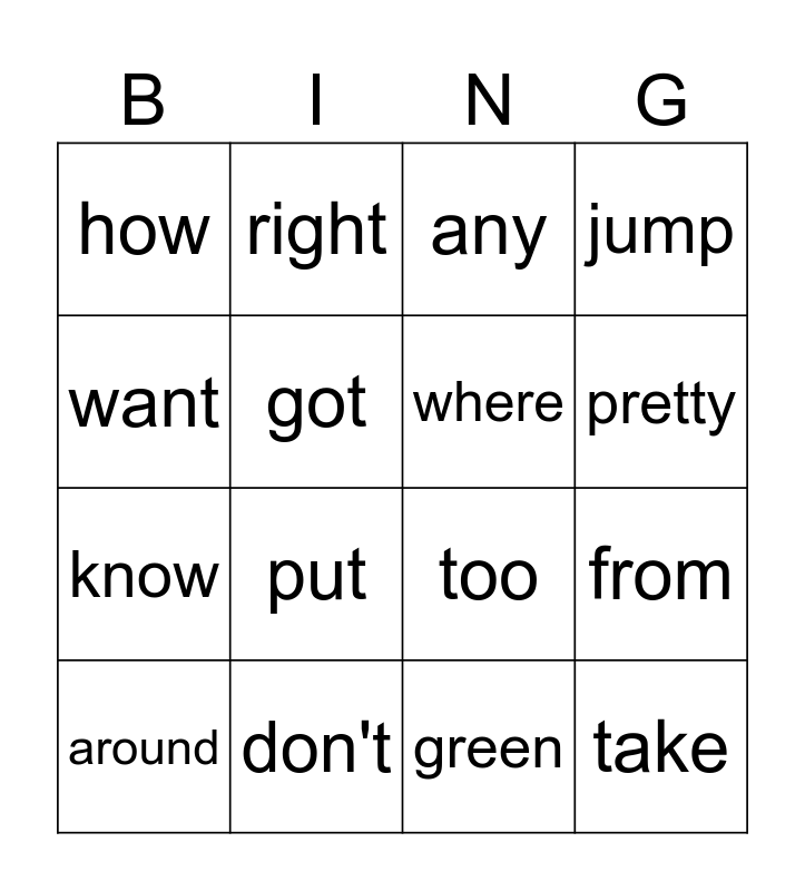 This bingo card has 20 words: from, good, any, about, around, want, don't, how, know, right, put, too, got, take, where, every, pretty, jump, green and four.