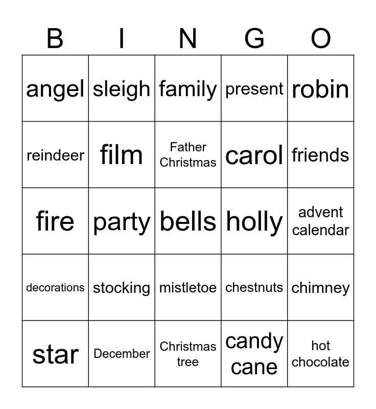 This bingo card has 25 words: stocking, Christmas tree, Father Christmas, star, robin, angel, reindeer, sleigh, holly, mistletoe, carol, fire, chestnuts, chimney, film, hot chocolate, advent calendar, family, friends, party, bells, December, decorations, present and candy cane.