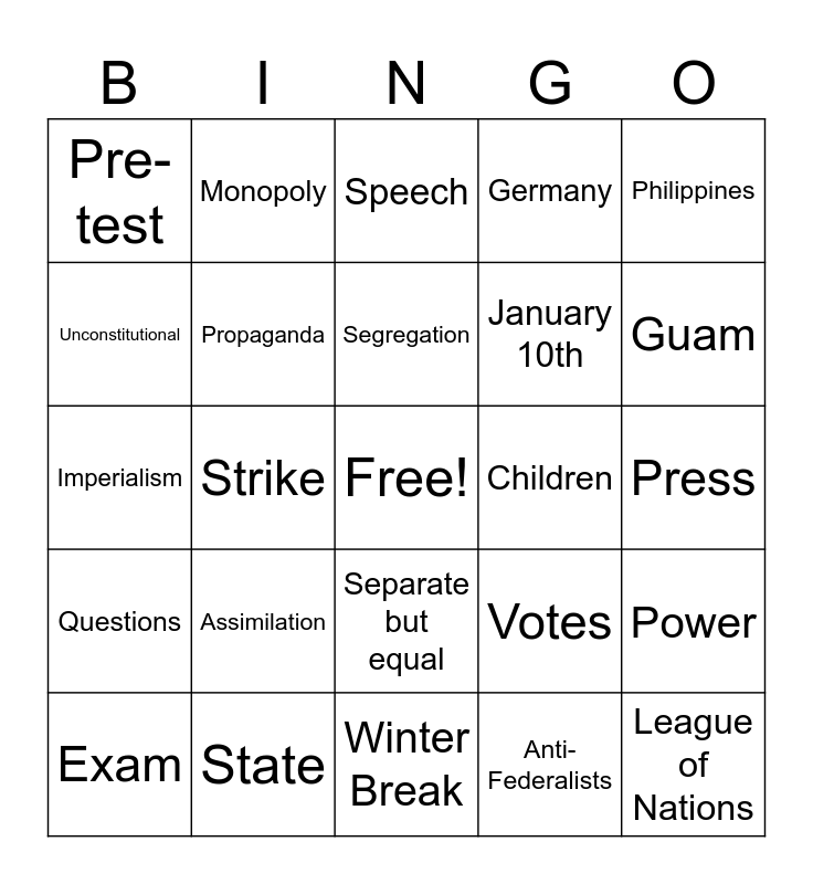 This bingo card has a free space and 29 words: Exam, Submarine, Strike, Senators, Pre-test, Speech, Propaganda, Assimilation, Children, State, Press, League of Nations, Winter Break, Anti-Federalists, Guam, Muckraker, Separate but equal, Questions, Philippines, Imperialism, Votes, Women, January 10th, Unconstitutional, Germany, Monopoly, Power, Segregation and Discrimination.