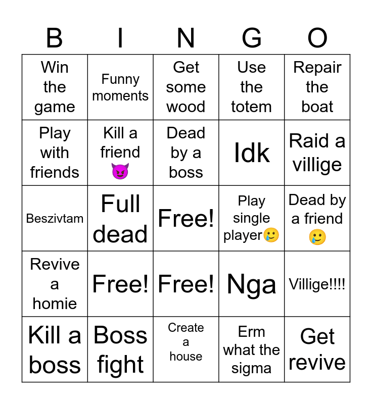 This bingo card has a free space and 24 words: Free!, Boss fight, Dead by a boss, Kill a boss, Repair the boat, Win the game, Play with friends, Funny moments, Play single player🥲, Free!, Idk, Beszivtam, Nga, Villige!!!!, Kill a friend😈, Erm what the sigma, Dead by a friend🥲, Get some wood, Raid a villige, Full dead, Get revive, Revive a homie, Use the totem and Create a house.