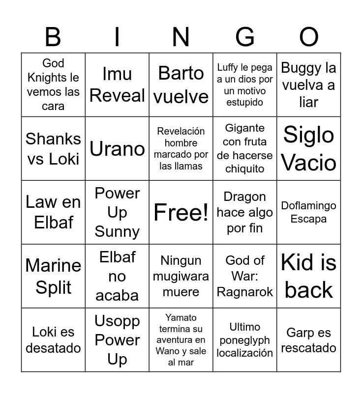 This bingo card has a free space and 24 words: Elbaf no acaba, Usopp Power Up, Revelación hombre marcado por las llamas, Loki es desatado, Buggy la vuelva a liar, God Knights le vemos las cara, Shanks vs Loki, Imu Reveal, Dragon hace algo por fin, Ningun mugiwara muere, Gigante con fruta de hacerse chiquito, Law en Elbaf, God of War: Ragnarok, Kid is back, Urano, Ultimo poneglyph localización, Doflamingo Escapa, Barto vuelve, Siglo Vacio, Power Up Sunny, Garp es rescatado, Marine Split, Luffy le pega a un dios por un motivo estupido and Yamato termina su aventura en Wano y sale al mar.