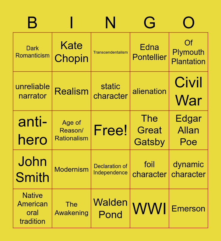 This bingo card has a free space and 29 words: Native American oral tradition, Colonialism/ Puritanism, Age of Reason/ Rationalism, Romanticism, Dark Romanticism, Transcendentalism, Realism, Modernism, The Great Gatsby, The Awakening, Edgar Allan Poe, Emerson, Walden Pond, WWI, Civil War, Benjamin Franklin, Declaration of Independence, John Smith, Of Plymouth Plantation, anti-hero, foil character, disillusionment, alienation, unreliable narrator, Edna Pontellier, Kate Chopin, dynamic character, static character and Tell-Tale Heart.