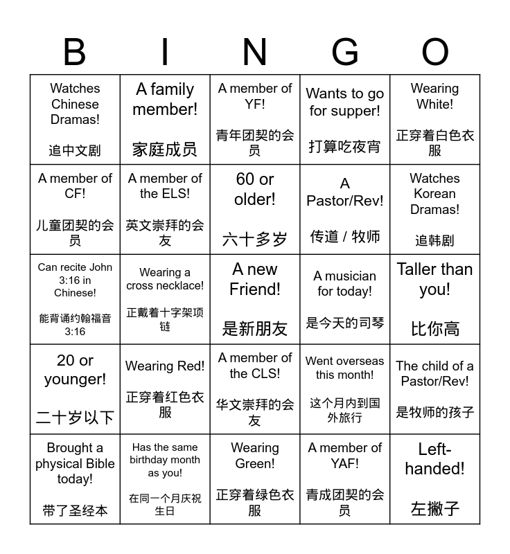This bingo card has a free space and 24 words: Wearing Red! 正穿着红色衣服, Has the same birthday month as you! 在同一个月庆祝生日, 60 or older! 六十多岁, Brought a physical Bible today! 带了圣经本, Wearing White! 正穿着白色衣服, Watches Chinese Dramas! 追中文剧, A member of CF! 儿童团契的会员, A family member! 家庭成员, A musician for today! 是今天的司琴, A member of the CLS! 华文崇拜的会友, A Pastor/Rev! 传道 / 牧师, Can recite John 3:16 in Chinese! 能背诵约翰福音3:16, Went overseas this month! 这个月内到国外旅行, The child of a Pastor/Rev! 是牧师的孩子, A member of the ELS! 英文崇拜的会友, A member of YAF! 青成团契的会员, Taller than you! 比你高, A member of YF! 青年团契的会员, Watches Korean Dramas! 追韩剧, Wearing a cross necklace! 正戴着十字架项链, Left-handed! 左撇子, 20 or younger! 二十岁以下, Wants to go for supper! 打算吃夜宵 and Wearing Green! 正穿着绿色衣服.