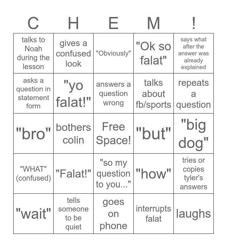 This bingo card has a free space and 29 words: "wait", sings or makes weird noises, bothers colin, calls someone a nickname, talks to Noah during the lesson, "Obviously", "yo falat!", "Falat!", "but", tells someone to be quiet, "big dog", laughs, goes on phone, interrupts falat, repeats a question, goes to falat's desk, "so my question to you...", "WHAT" (confused), says what after the answer was already explained, "bro", "how", says he's smart or understands, talks about fb/sports, asks a question in statement form, "Ok so falat", gives a confused look, tries or copies tyler's answers, answers a question wrong and "huhh".