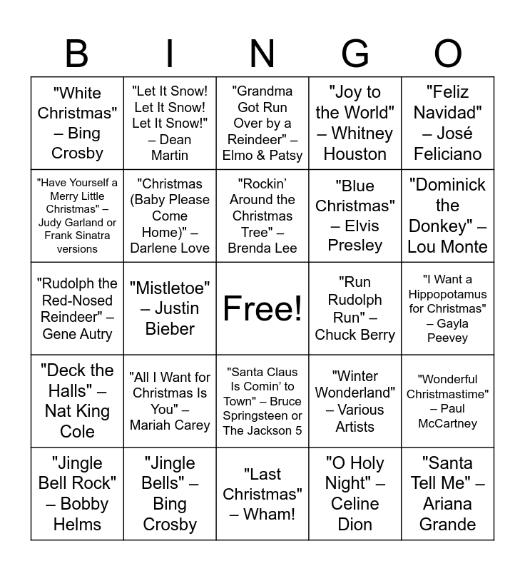 This bingo card has a free space and 25 words: "All I Want for Christmas Is You" – Mariah Carey, "Last Christmas" – Wham!, "Rockin’ Around the Christmas Tree" – Brenda Lee, "Jingle Bell Rock" – Bobby Helms, "Feliz Navidad" – José Feliciano, "White Christmas" – Bing Crosby, "Have Yourself a Merry Little Christmas" – Judy Garland or Frank Sinatra versions, "Let It Snow! Let It Snow! Let It Snow!" – Dean Martin, "Run Rudolph Run" – Chuck Berry, "Santa Claus Is Comin’ to Town" – Bruce Springsteen or The Jackson 5, "Blue Christmas" – Elvis Presley, "Rudolph the Red-Nosed Reindeer" – Gene Autry, "Winter Wonderland" – Various Artists, "Wonderful Christmastime" – Paul McCartney, "Christmas (Baby Please Come Home)" – Darlene Love, "The Chipmunk Song (Christmas Don’t Be Late)" – Alvin and the Chipmunks, "I Want a Hippopotamus for Christmas" – Gayla Peevey, "Grandma Got Run Over by a Reindeer" – Elmo & Patsy, "Dominick the Donkey" – Lou Monte, "Mistletoe" – Justin Bieber, "Santa Tell Me" – Ariana Grande, "Jingle Bells" – Bing Crosby, "Deck the Halls" – Nat King Cole, "Joy to the World" – Whitney Houston and "O Holy Night" – Celine Dion.