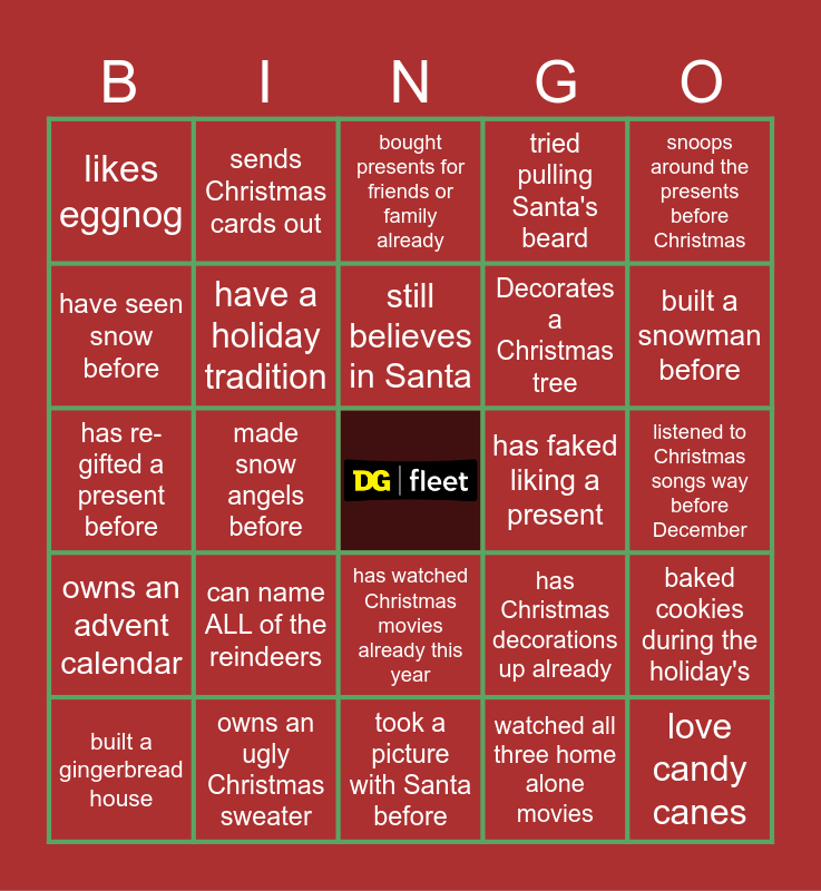 This bingo card has a free space and 24 words: can name ALL of the reindeers, owns an ugly Christmas sweater, still believes in Santa, built a gingerbread house, snoops around the presents before Christmas, likes eggnog, have seen snow before, sends Christmas cards out, has faked liking a present, has watched Christmas movies already this year, Decorates a Christmas tree, has re-gifted a present before, has Christmas decorations up already, baked cookies during the holiday's, have a holiday tradition, watched all three home alone movies, listened to Christmas songs way before December, bought presents for friends or family already, built a snowman before, made snow angels before, love candy canes, owns an advent calendar, tried pulling Santa's beard and took a picture with Santa before.