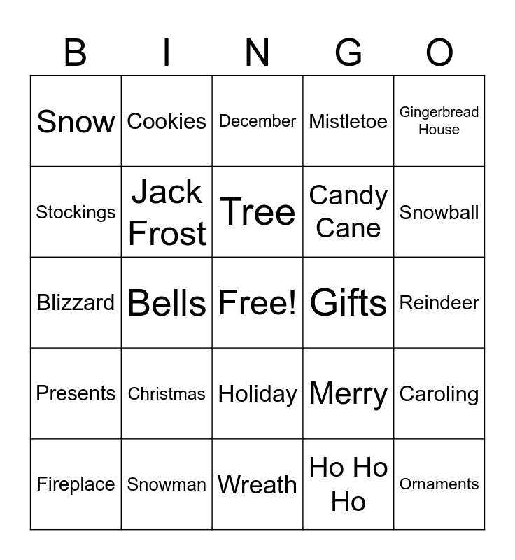 This bingo card has a free space and 38 words: Santa, Saint Nick, Rudolph, Jack Frost, Caroling, Christmas, Tree, Card, Gingerbread House, Candy Cane, Bells, Mistletoe, Ornaments, Reindeer, Stockings, Presents, Eggnog, December, Elves, Gifts, Snow, Snowman, Snowball, Fireplace, Cold, Wreath, North Pole, Nutcracker, Mrs. Clause, Santa’s Hat, Sleigh, Holiday, Ho Ho Ho, Cookies, Joy, Merry, Blizzard and Winter.