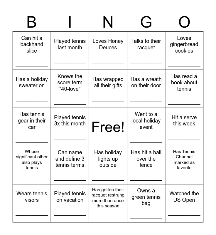 This bingo card has a free space and 24 words: Can name and define 3 tennis terms ___________, Played tennis on vacation ___________, Has wrapped all their gifts ___________, Wears tennis visors ___________, Loves gingerbread cookies ___________, Can hit a backhand slice ___________, Has a holiday sweater on ___________, Played tennis last month ___________, Went to a local holiday event ___________, Has holiday lights up outside ___________, Has a wreath on their door ___________, Has tennis gear in their car ___________, Has hit a ball over the fence ___________, Has Tennis Channel marked as favorite ___________, Knows the score term "40-love" ___________, Owns a green tennis bag ___________, Hit a serve this week ___________, Loves Honey Deuces ___________, Has read a book about tennis ___________, Played tennis 3x this month ___________, Watched the US Open ___________, Whose significant other also plays tennis ___________, Talks to their racquet ___________ and Has gotten their racquet restrung more than once this season ___________.