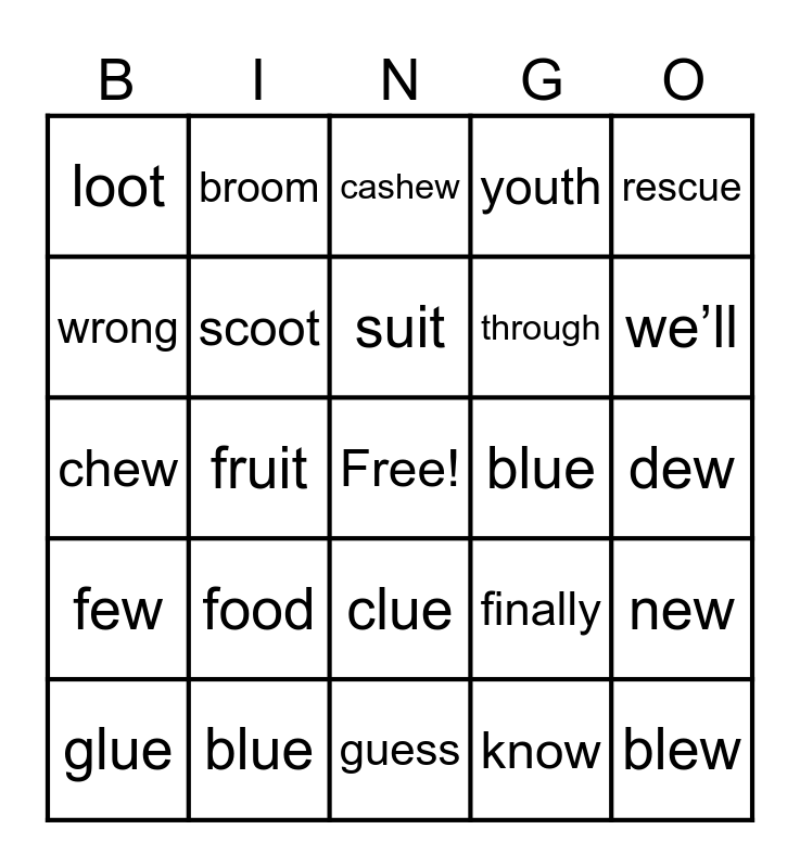 This bingo card has a free space and 41 words: argue, chew, juice, scoot, blue, clue, suit, soup, rescue, few, fruit, youth, blew, dew, blue, food, mood, loot, value, cashew, new, around, guess, through, good, anything, know, they’ll, we’ll, I'll, room, broom, glue, even, finally, wrong, friend, one, with, open and before.